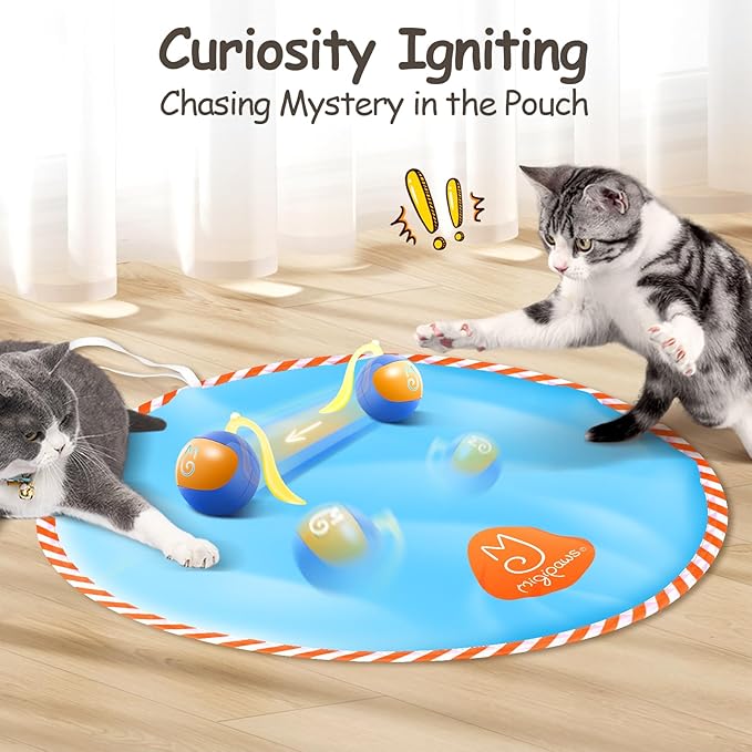- 【Curiosity Igniting Design】: Migipaws uniquely designed interactive cat toy features a glowing rolling ball placed inside a 23" circular bag with blue color stripes, The ball moves randomly beneath the fabric, resembling a mysterious small animal, igniting the cat's curiosity to pounce, claw, and catch for extended periods of time.