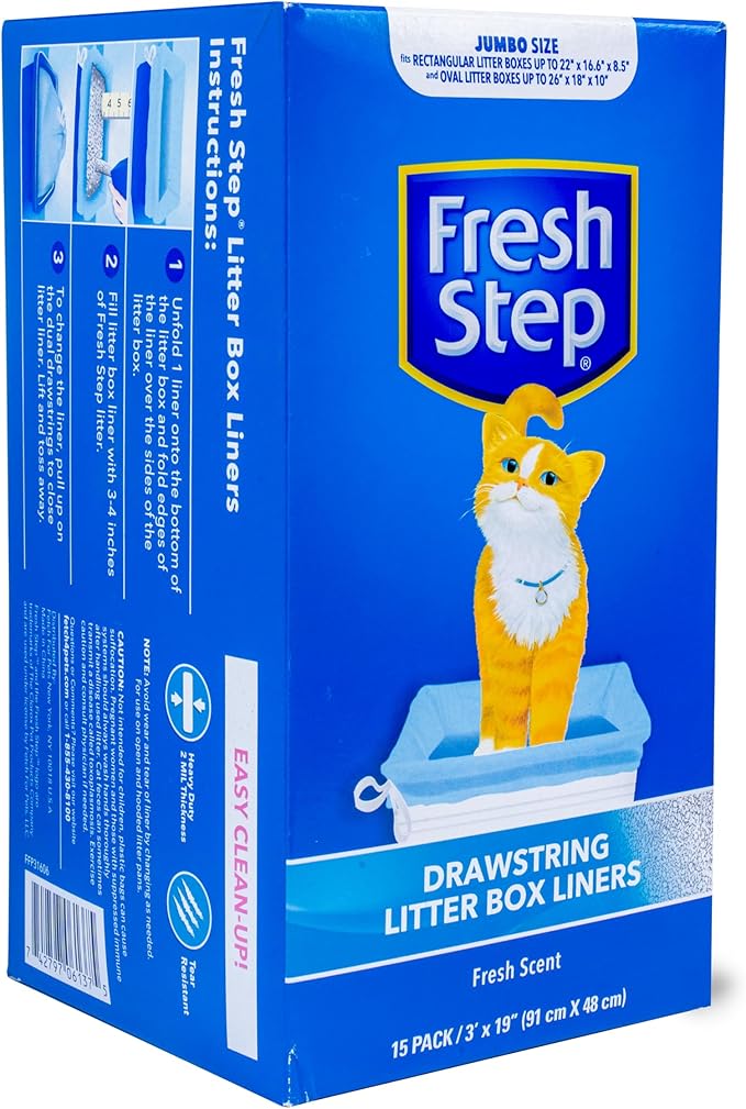 Fresh Step Drawstring Cat Litter Box Liners, Fresh Scent, Size Jumbo, 36" x 19" | Kitty Litter Bags - 15 Count - Cat Litter Liners for Rectangle or Oval Large Litterboxes