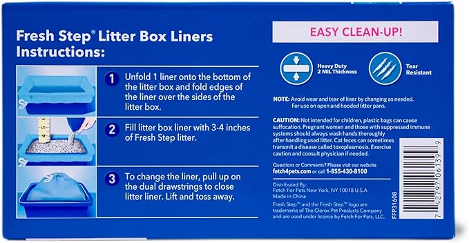 - FITS MOST CAT LITTER BOXES UP TO 15” x 9” x 8” - These Fresh Step large litter box liners will fit most large litter pans and can conform to rectangular or oval shaped boxes, as well as covered or open boxes.