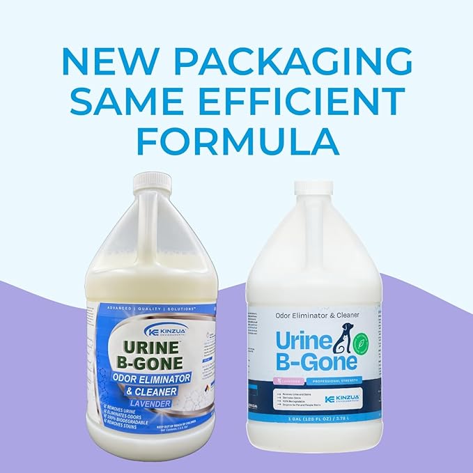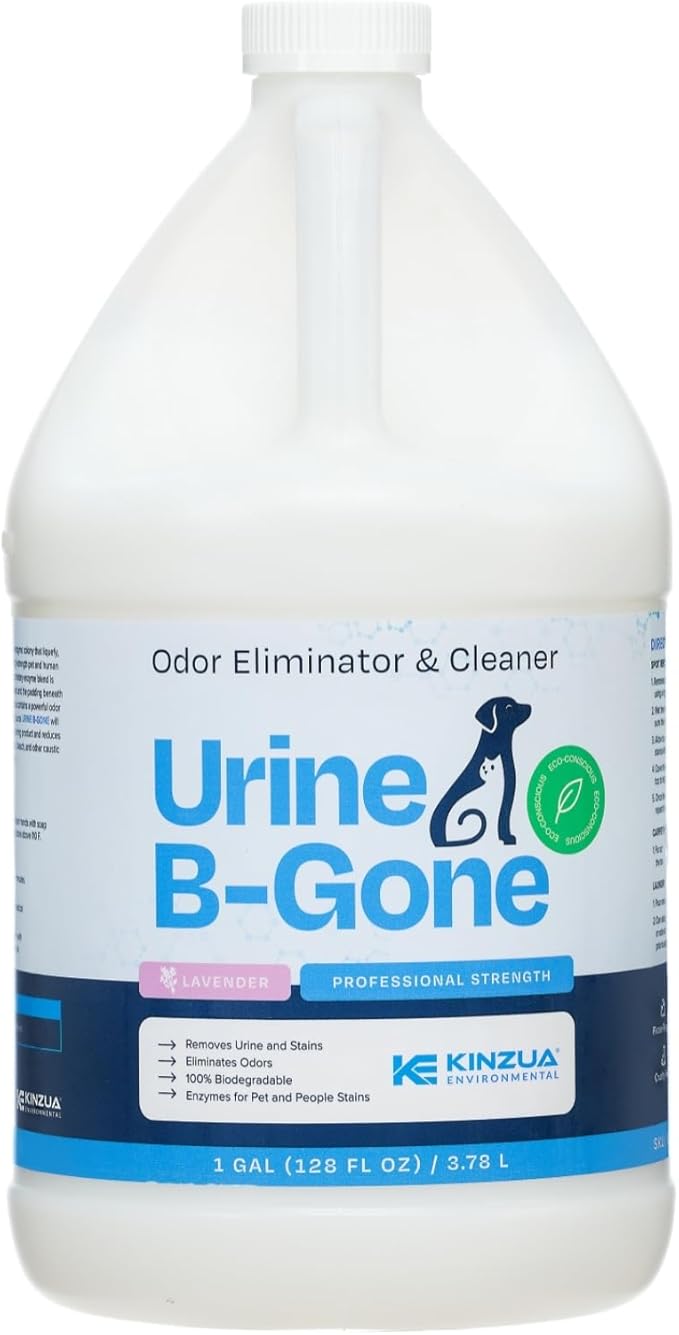 KINZUA ENVIRONMENTAL Urine B-Gone, Professional Enzyme Odor Eliminator & Pet Stain Remover, Human, Cat & Dog Urine Cleaner, Effective on Laundry, Carpets & More, Lavender Scent, 1 Gallon