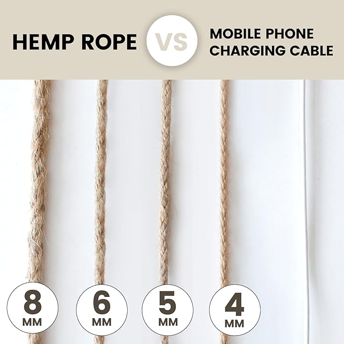 - Product size: We provide hemp ropes of 4mm, 5mm, 6mm and 8mm in thickness and 164ft and 328ft in length. You can choose the appropriate length and thickness according to your needs