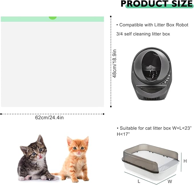 - Compatibility: Mooydee disposable Waste Drawer Liners are specifically designed for automatic cat litter boxes, which are compatible with litter box robot 4, 3, 2 waste drawer;; With their large capacity, these litter liners easily fit automatic litter box and self-cleaning litter box drawers (Not recommended for standard cat boxes); And also, the liners are suitable for a variety of indoor and outdoor household trash disposal usages