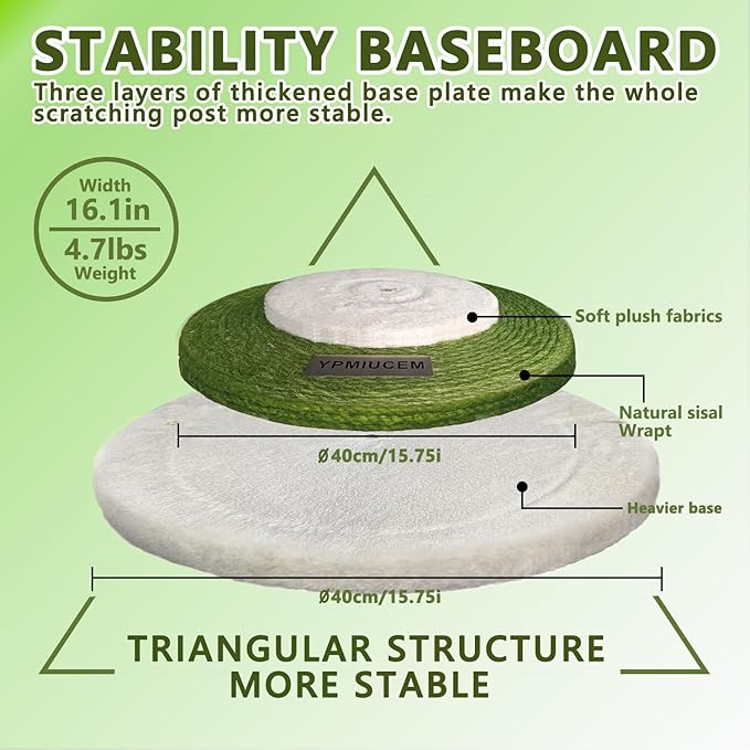 - 【Thick and Sturdy Base】The 33'' tall cat scratching post with 3 layers sturdy wood laminated, refuse to cheap cut base,the heavier bottom plus thicker post makes the cat scratching post less likely to tip over and shake..The bottom is surrounded by flannel, which increases friction and is not easy to slide. And the soft flannel brings a comfortable experience to the cat.Furthermore, four anti-slip pads provide extra stability while protecting your floor.