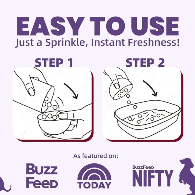 - Unparalleled Litter Box Odor Eliminator: Enjoy immediate odor neutralization with a simple sprinkle. Our litter odor eliminator not only tackles odors on contact but also keeps your cat’s litter box continuously fresh, reducing the need for frequent scooping.