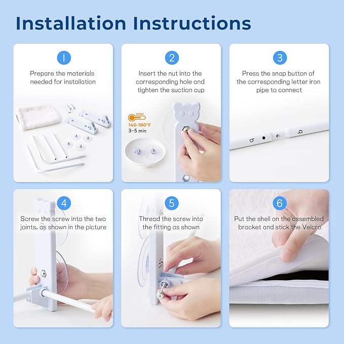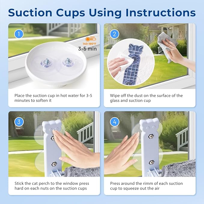 - Installation Tip: Soak the suction cup in hot water for 3 minutes before installation, soften and dry it, wipe the window, stick the suction cup on the window, and press hard to discharge air. The suction cup will be more firmly attached to the window.