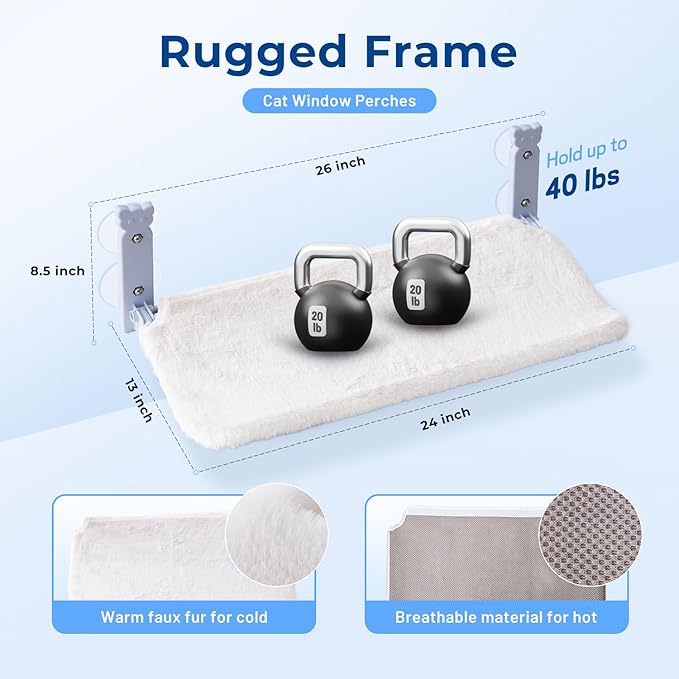 - Durable and Sturdy: 4 wide suction cups and a sturdy metal steel Frame can weigh about 40 pounds for two large cats. Strong and durable, heavy cat jumping will not deform the cat hammock.
