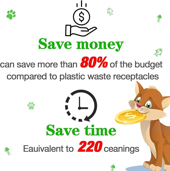 - Litter liners equivalent to 220 cleanings compared to plastic waste receptacles, simply swap out the liners and re-use the receptacle multiple times, saving more than 90%, cut down on the expense of the plastic containers.