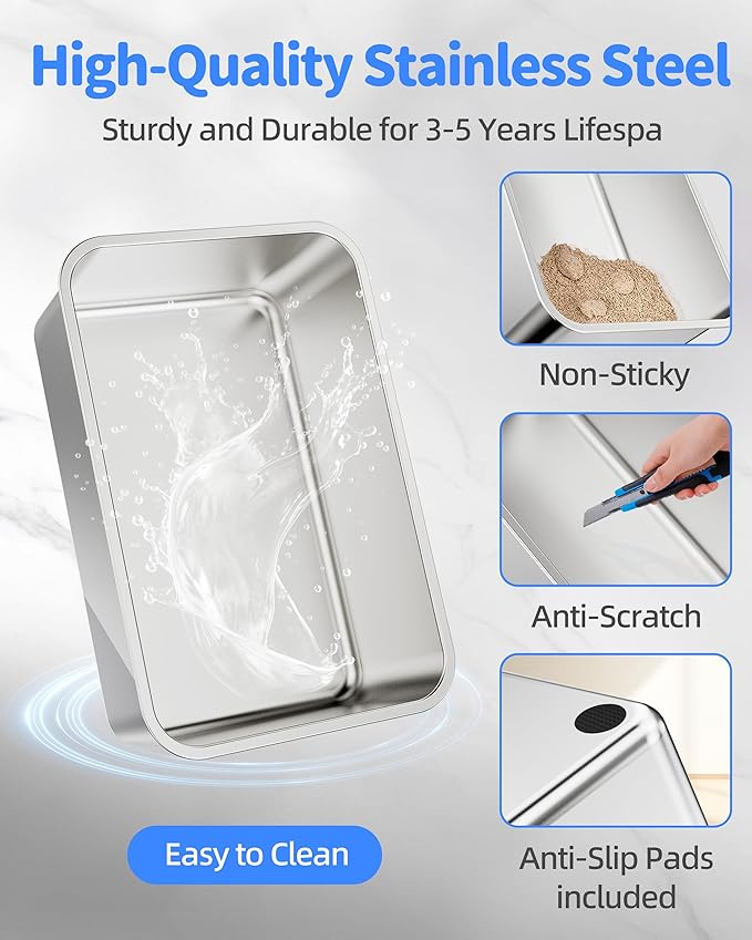 - [TOTALLY ODORLESS& EASY CLEAN]: Our large stainless steel litter box combines high-quality durable 304 stainless steel. Unlike plastic alternatives, it resists odor absorption, keeping your space fresh. With our complimenary cleaning brush, the sleek and non-stick surface makes cleaning a breeze, while the robust stainless steel construction ensures it won't rust or scratch, offering long-lasting performance.