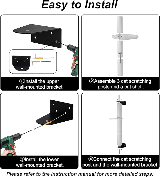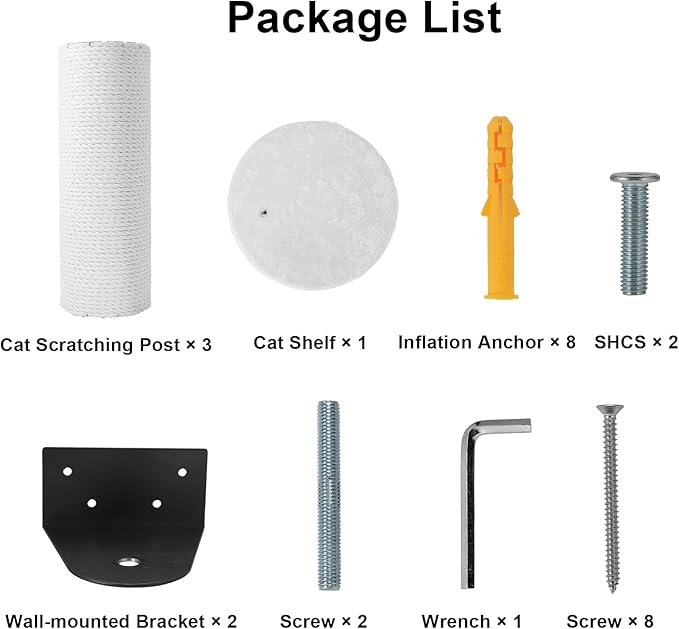 - 【Multifunctional & Easy to Install】 The wall mounted cat scratcher with cat shelf has multiple functions and can meet the various needs of cats, including scratching, stretching, climbing, napping and head massage, etc. It is an ideal place for cats to move around and rest. Furthermore, the sisal cat scratcher is easy to install. You only need to tighten the screws step by step according to the included accessories and the instruction.