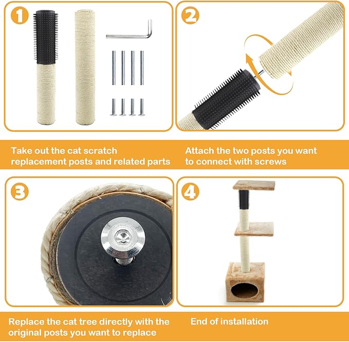 - Cat Tree Parts in Package:2pcs sisal replacement poles,2pcs replacement cat tree parts with brush;Cat scratch post replacement size is 15.7''x2.75'';scratching post for cats is matching with M8 screws to change original and broken cat scratch pole easily