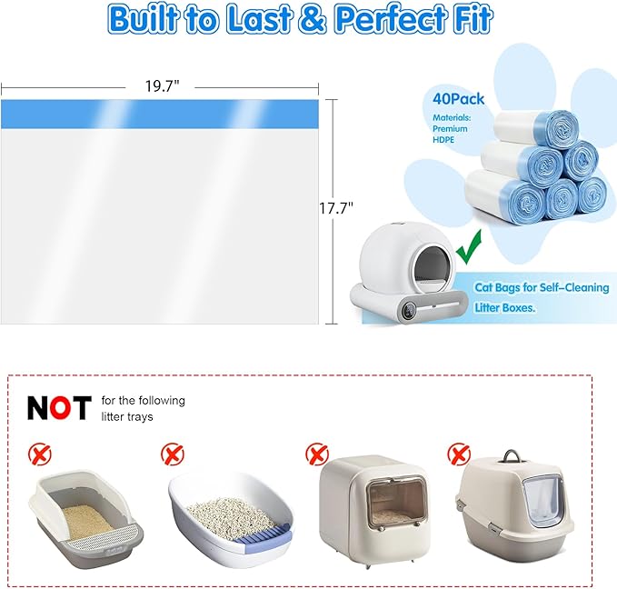 - Durable Materials: Crafted from robust HDPE plastic, Automatic litter box bags are 30% thicker (1.5 MIL) than standard bags, offering exceptional tear resistance and durability. With a maximum load capacity of 22Ibs, they prevent leaks and ensure no cat litter escapes. Cat litter bags are designed to handle heavy use while keeping your automatic cat litter box self cleaning and hassle-free.
