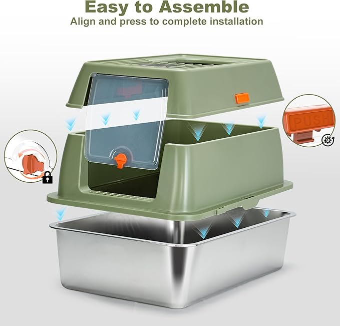 - đăEasy to Clean, No OdorsăThe stainless steel kitten litter box is made of high quality abs material and 304 stainless steel. The top entry litter box will not absorb any odors. The smooth surface is non-stick and easy to clean.