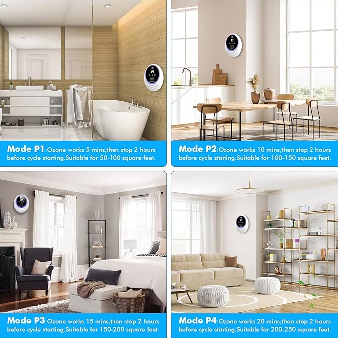 - 【Notes】The 4 working modes P1/P2/P3/P4, which respectively correspond to the largest usage scenario of 5-10 square meters (approximately 50-100 square feet), 10-20 square meters (about 100-150 square feet), 20-30 square meters (about 150-200 square feet), 30-40 square meters (about 200-250 square feet). Beside, if your environment has a strong odor radiation source, please clean up the odor radiation source first, and then use our products for deodorization. You will achieve good results.