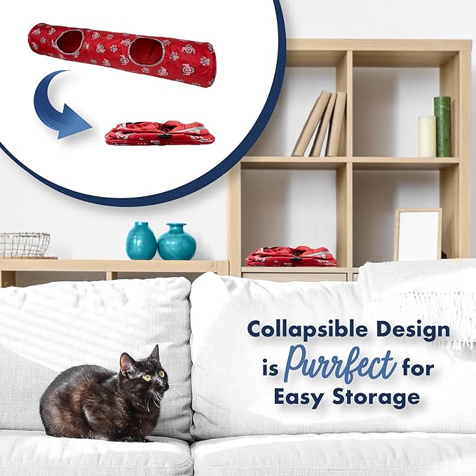 - SAFE, STRONG, DURABLE and Pet-Friendly Material: Made with sturdy, pet-safe materials, the tunnel is designed to withstand the energy of playful cats while ensuring their safety and comfort during play. - - - EZ Collapsible & portable to store away and to take with you on the go!