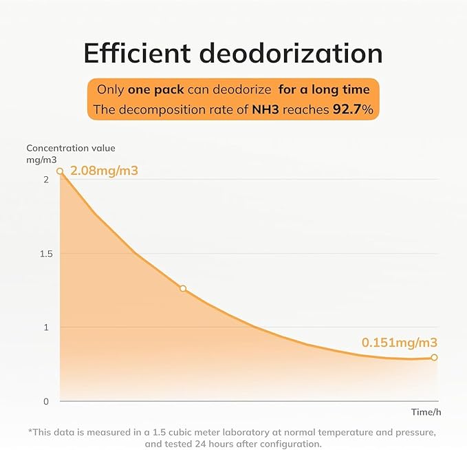 - Efficient deodorisation: ammonia degradation rate of up to 92.7%, efficiently removes the smell of cat waste and urine in the litter box