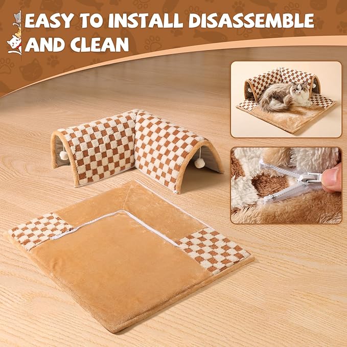 - đăSelected Fabric, Comfortable in All SeasonsăThe indoor cat tunnel bed with blanket and tunnel consists of zippers. It is sturdy, warm, scratch-resistant and non-pilling. The bottom also has a non-slip design, suitable for all seasons