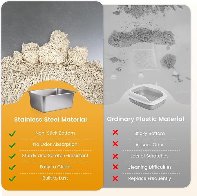 - Note: This litter box set does not have a litter shovel Deep Design to Prevent Litter Scatter: This stainless steel cat litter box features a high-depth design (5.91 inches) that helps prevent litter from being kicked or scattered out by your pet, keeping your floors clean and reducing mess.