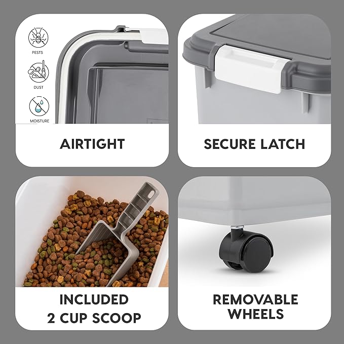 IRIS USA Airtight Dog Food Storage Container with Wheels, Up to 30 lbs & 11 lbs, 2-Cup Scoop, Cat Dog Treat Wet Food Cans Toys Storage Container, Stackable, Portable, Gray