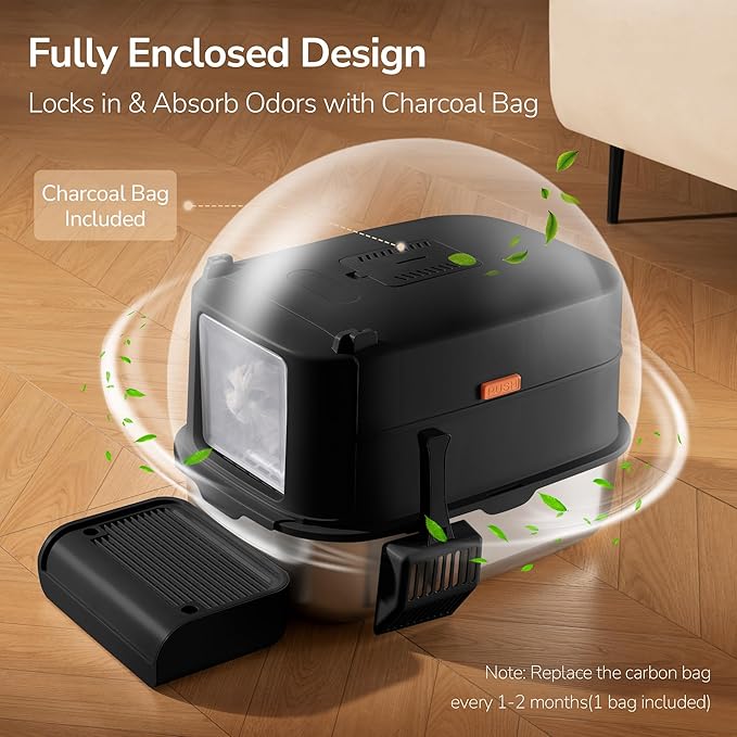 - Fully Enclosed & Odor Control: The fully enclosed design of covered litter boxes for cats locks in odors, and the included charcoal bag absorbs smells. Replace the carbon bag every 1-2 months for optimal performance (1 bag included).