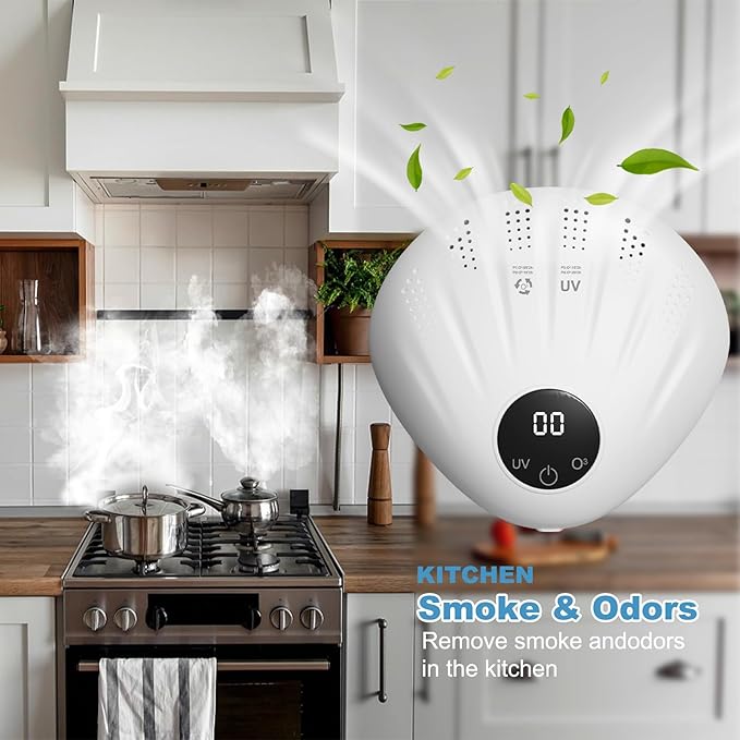 - 【Comprehensive Odor Elimination】Ozone Machine is engineered to effectively remove odors stemming from sources,Kitchen oil fume odor, bathroom shoe cabinet odor, including cat litter boxes, dog urine, smoke, basement musty odor, and more. Bid farewell to unpleasant smells and a fresh and comfortable environment. Long press for three seconds to power on.