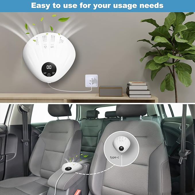 - 【Completely Portable&Type-c Charging】This upgraded Type-C interface of the deodorizer can be used for mobile phone, computer, and car charging, making it easy to carry and deodorize at any time. It also comes with a 5V power adapter (100V-240V) that can be plugged in when the battery is depleted. just put it on your table or hung on the wall, on the shelf. Note: You need to purchase accessories by yourself and hang them on the wall.