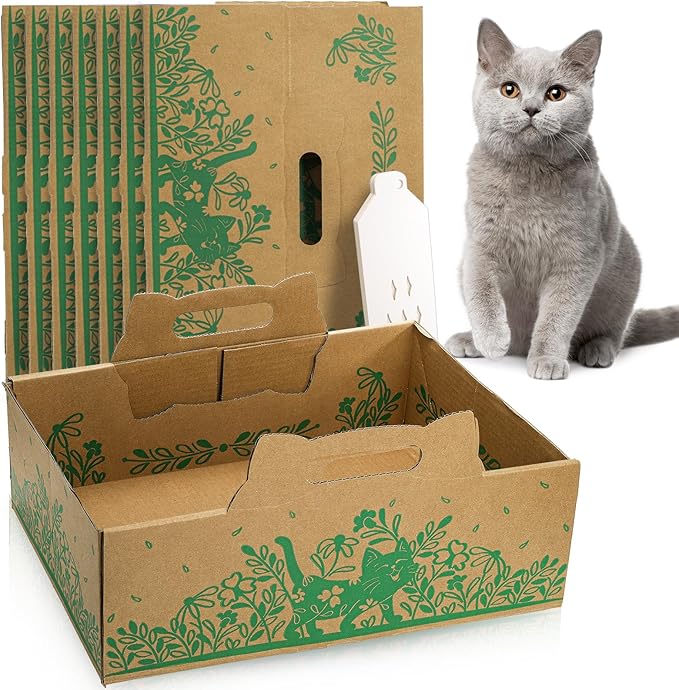 WUWEOT 8 Pack Disposable Cat Litter Boxes, Leakproof Double Layer Cardboard Cat Litter Pan, Foldable Portable Small Pet Liner Tray with Scoop for Travel, 15.8 x 11.7 x 5.8 Inch