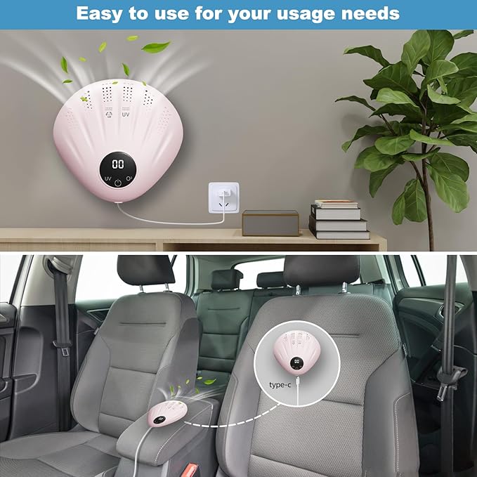 - 【Completely Portable&Type-c Charging】This upgraded Type-C interface of the deodorizer can be used for mobile phone, computer, and car charging, making it easy to carry and deodorize at any time. It also comes with a 5V power adapter (100V-240V) that can be plugged in when the battery is depleted. just put it on your table or hung on the wall, on the shelf. Note: You need to purchase accessories by yourself and hang them on the wall.