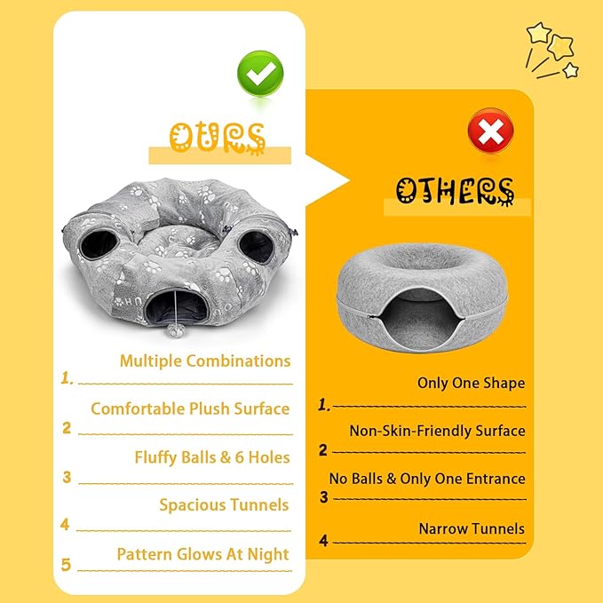 - Multiple Shape Combinations - The zipper separation design can be shaped into circular, S-shaped, semi-circle, or any other shape you like. Add a straight cat tunnel to create an extremely long labyrinth tunnel for your pet.6 hole design is the perfect setup for multiple cats playing. Come and play hide and seek with your cat!
