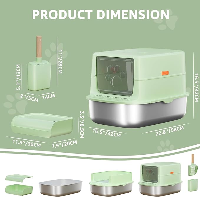 Enclosed Stainless Steel Cat Litter Box with Lid, XL Extra Large Litter Box for Big Cats Multi-Cats with High Sided Enclosure & Scoop, Odor-Free,Anti-Leakage, Non-Sticky, Easy Cleaning (D-Green)